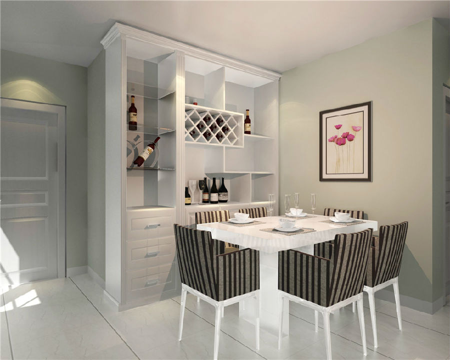 整體色彩采用純白色系,大面積的使用,使整體格局顯得十分整潔與開闊,空間十足,純白色的酒柜與整體風格相呼應(yīng),在收納面積增大的同時,也展現(xiàn)了收納的美學。