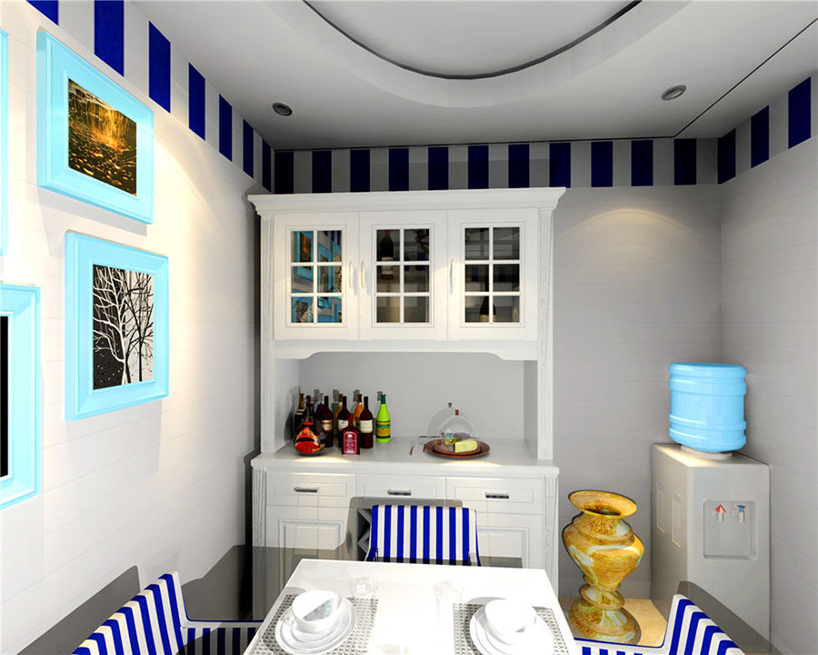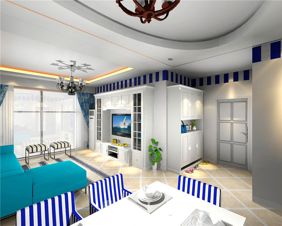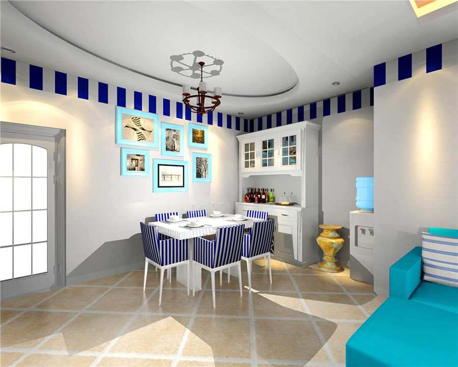 就整體布局來看,視覺上十分寬闊,顯得比較有格局。色彩搭配的話,純白色與深藍色的撞擊,不會顯得很突兀,反而給人一種眼前一亮的感覺。朱紅色與白色相間的吊燈造型,讓整體氛圍更加貼近自然。